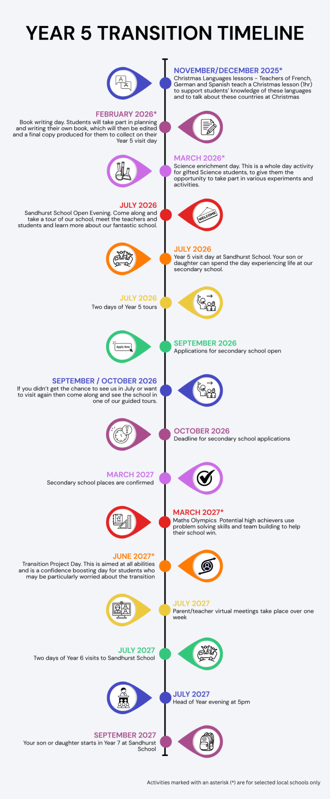 Our step-by-step roadmap, which you can see below, breaks down the key stages and milestones you'll encounter along the way. From initial exploration and open evenings in Year 5 to the exciting induction days and that momentous first day of Year 7, this infographic provides a clear and reassuring overview. Our goal is to ensure you feel informed, prepared, and excited about joining the Sandhurst School community.